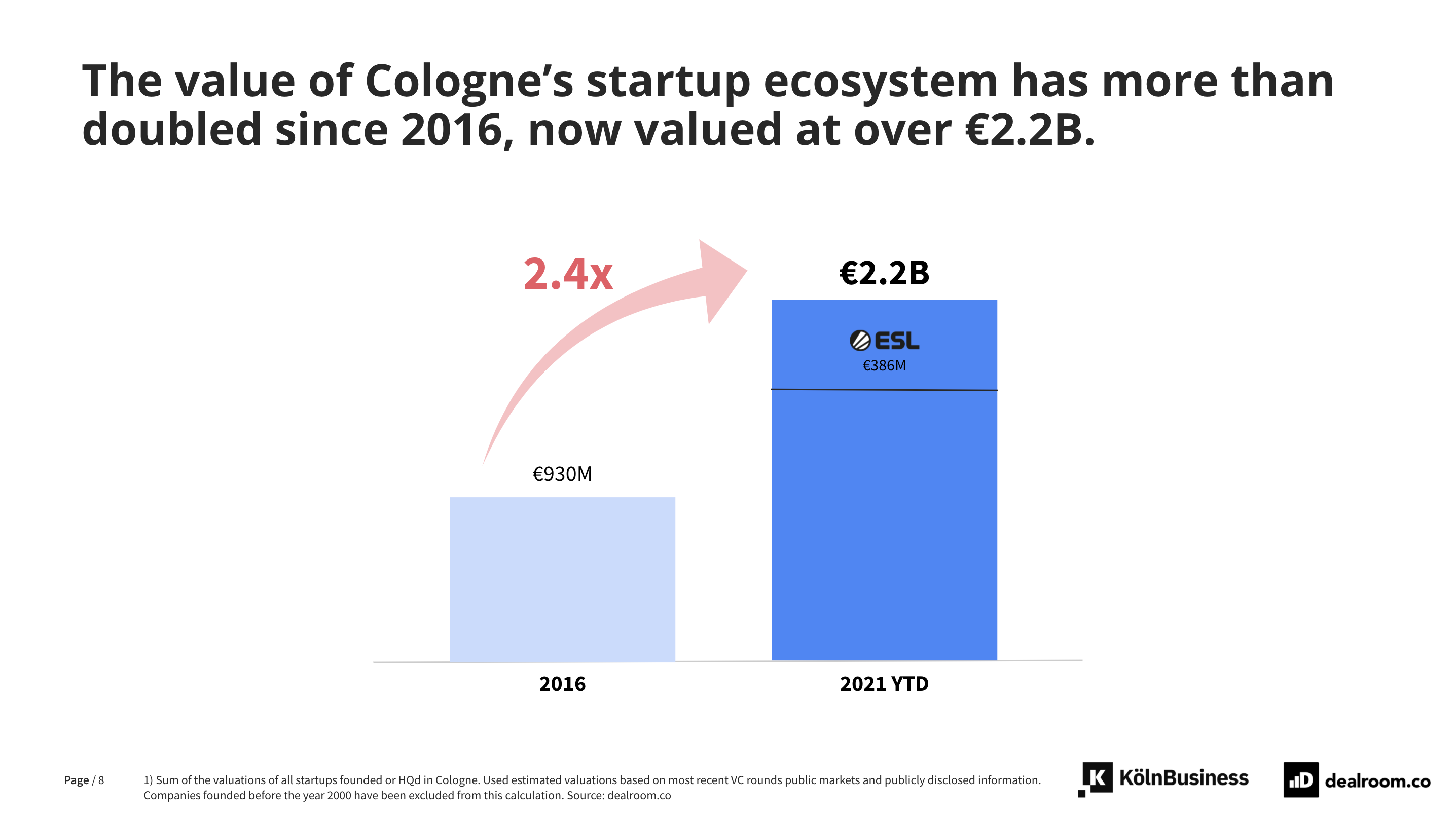 The Cologne startup ecosystem has seen significant growth in the last five years, with the combined value of startups in the city more than doubling since 2016. A significant chunk of the value comes from ESL, the world-renowned esports company founded and still headquartered in the city. ESL are putting Cologne on the gaming and esports map, and despite multiple global offices, continues to host some of its biggest events in their hometown stadium.