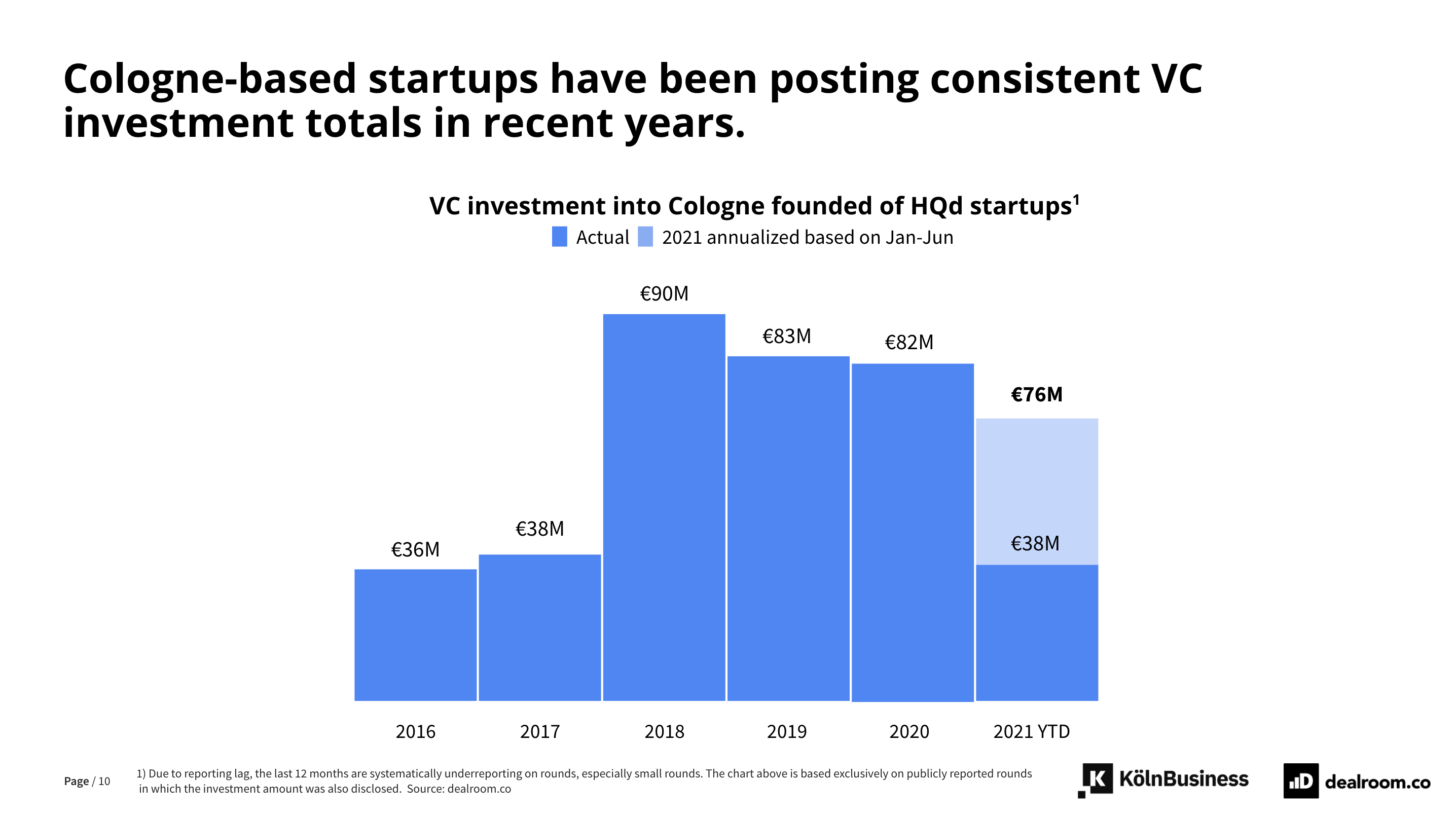 VC investment into Cologne-based startups has been consistent in recent years, though there is still also significant room for improvement. A high percentage of Cologne’s capital comes from local investors compared to other German and European cities. If startups can start grabbing the attention of international capital, we could see a step change in development for the Cologne startup ecosystem.