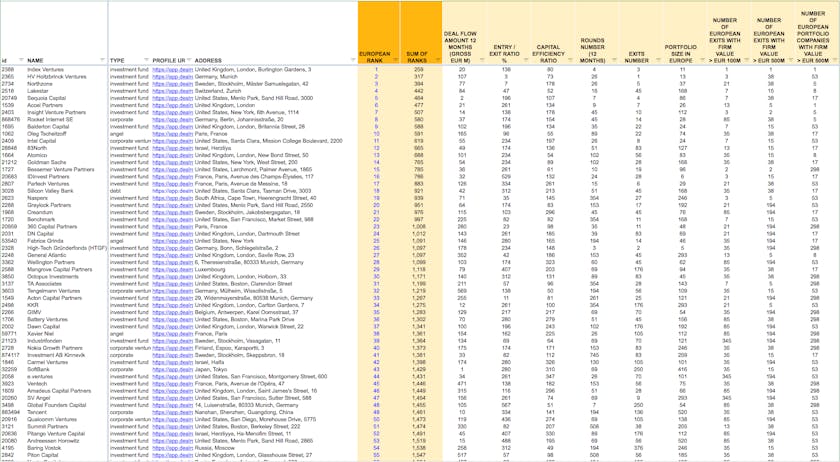 Most Prominent means not just who’s the best investor. It’s about which investors are the most relevant for founders today. Therefore we also look at how active an investor is. The ranking was born out of pure necessity: Dealroom’s investor database is so large that some logical ranking needed to be implemented to improve usability.