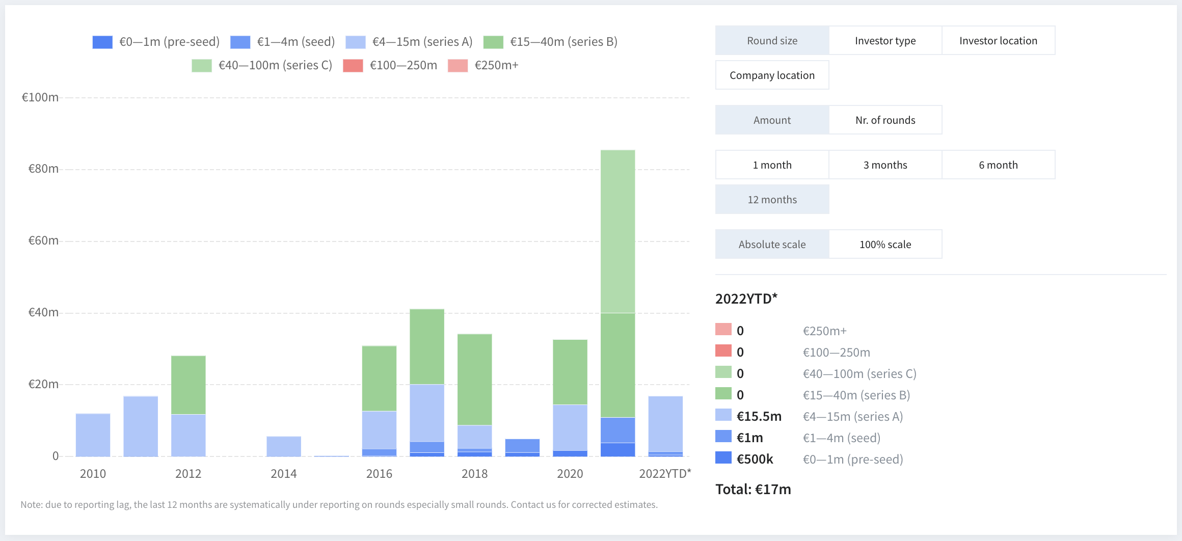 Over the past decade there has been a steady increase of available capital to fund startups across Cyprus. We saw an increase in the number of recorded rounds over the last decade, particularly in early-stage investment (Pre-seed to Series A). With €85.5M raised, 2021 was a record breaking year for Cypriot startups, like most places in the world. 2022 seems to be be back to pre-pandemic levels, so far Cyprus-based startups raised €17M this year.