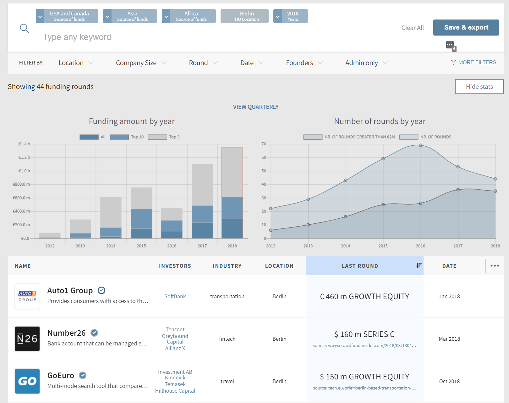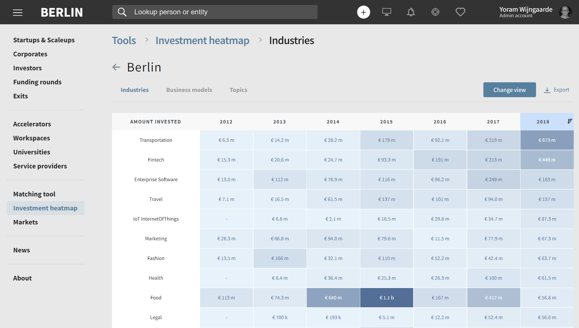 Another example is the heatmap, which enables you to easily review Berlin trends by industry vertical, business model and topic. Click on any amount to see the underlying deals.