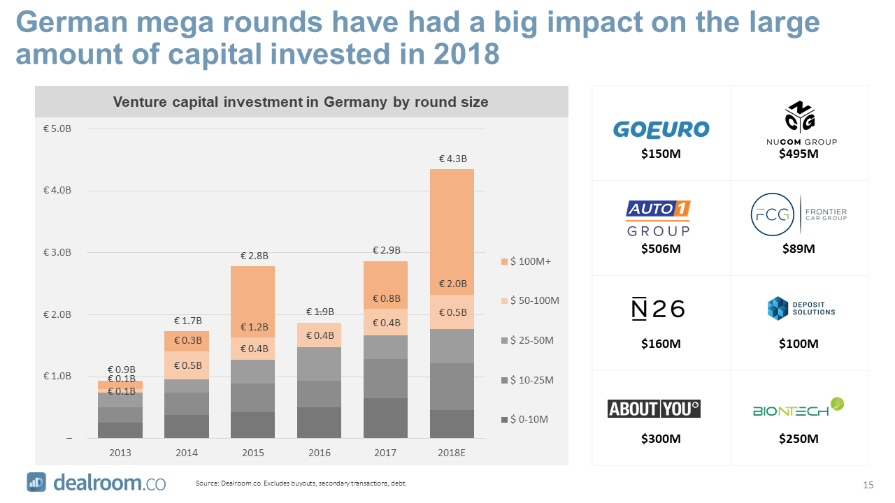 The report shows that investment in German startups is on track to reach record levels, exceeding €4 billion in 2018. That’s partly driven by a few mega-rounds, more so than in France and the UK.
