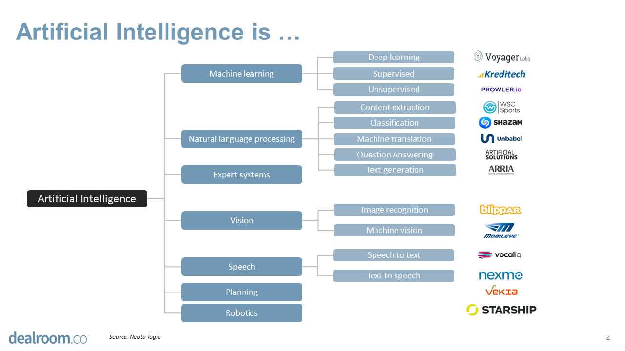 The above shows that AI is the most frequently occuring description within Deep Tech (it is also the broadest definition). The below schematic from Neota Logic shows the fields of specialisation within AI. For example, machine learning is a more narrowly defined specialisation within AI (where algorithms learn themselves, without needing to be literally 100% pre-programmed). These fields are not mutually exclusive. For example, natural language processing, vision, and speech recognition all make frequent use of machine learning.