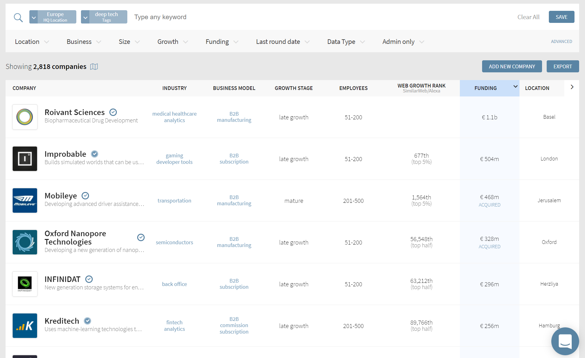 The below data table shows several high-profile deep tech companies, ranked by amount of VC funding. The top three funded Deep Tech companies in Europe and Israel are Roviant, Improbable and Mobileye (click to open data-table):