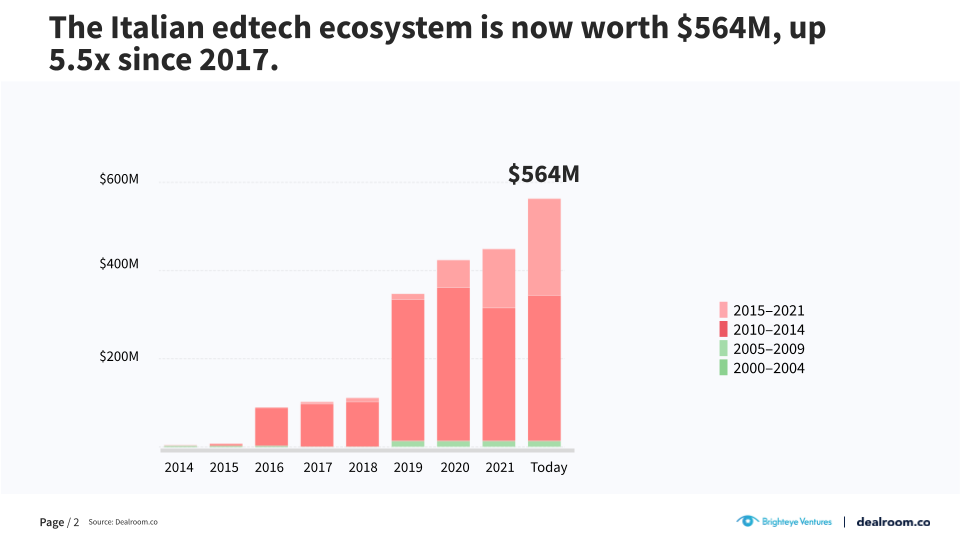 It’s positive for the Italian ecosystem that such a large portion of startups have been formed in recent years. We can expect a maturing process to take place in the coming period including more deals, larger rounds, and the formation of stronger Edtech hubs as the number of Edtech specialists increases. The Italian market is large enough to be on the radar of any serious investor and Edtech founding team as an option for European expansion. But to date, this presence on the radar hasn’t materialized into much investment or expansion activity, relative to Europe’s most active hubs. The momentum the market has witnessed in recent years tells us that this shift is happening and happening quickly. The market represents an attractive opportunity for early stage investors like Brighteye Ventures.