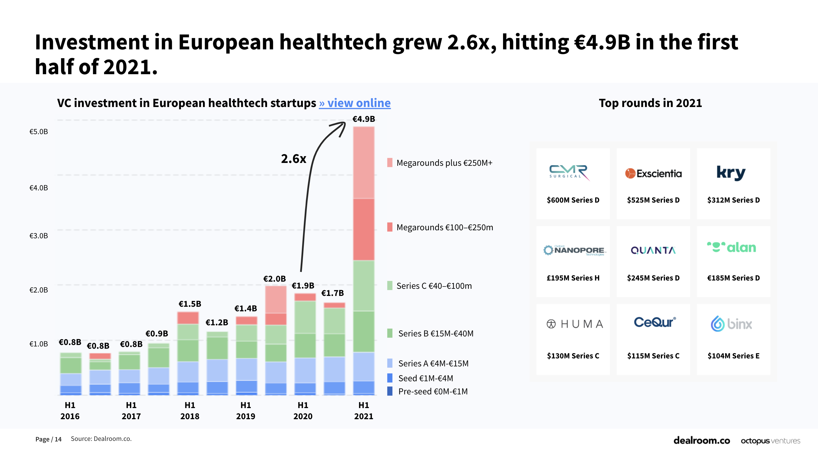 European Healthtech investment hit €4.9B in the first half of 2021, 2.6x the H1 2020 total, while biotech startups added an additional €2.9B. While megarounds accounted for around half of all investment in the first six months of the year, there has been investment growth at every round stage, from pre-Seed to late stage.
