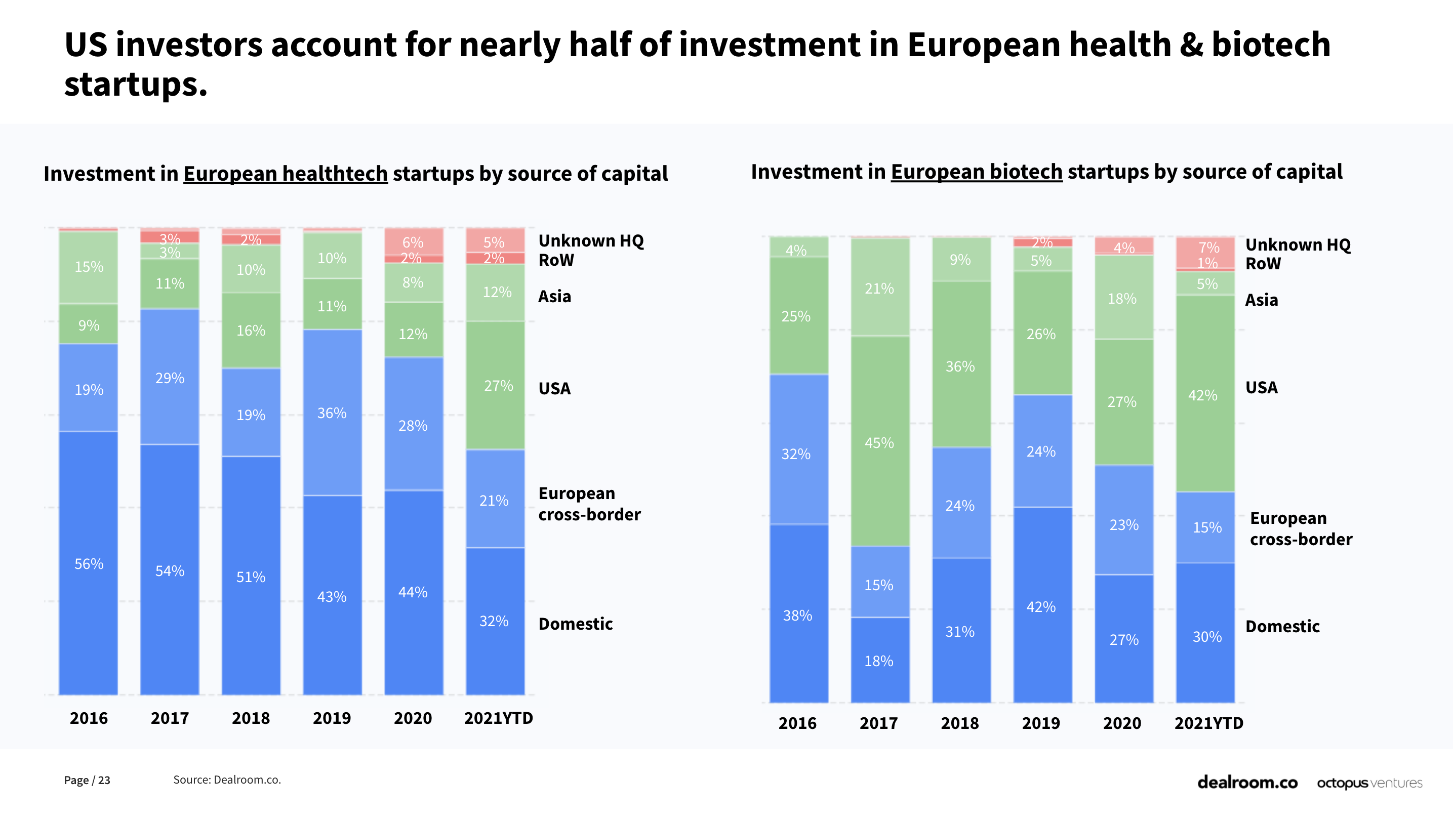 European innovation in health and biotech is grabbing the attention of international investors. US investors account for nearly half of all European startup investment in health and biotech – a growing proportion.