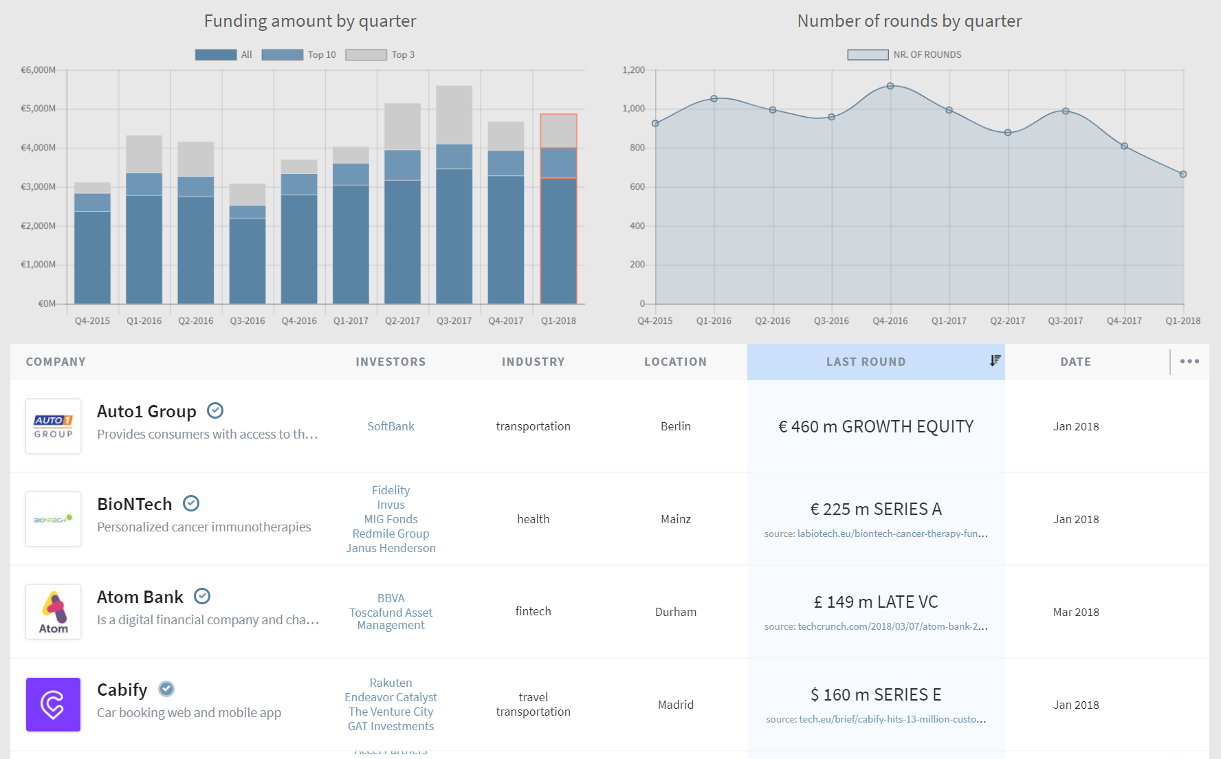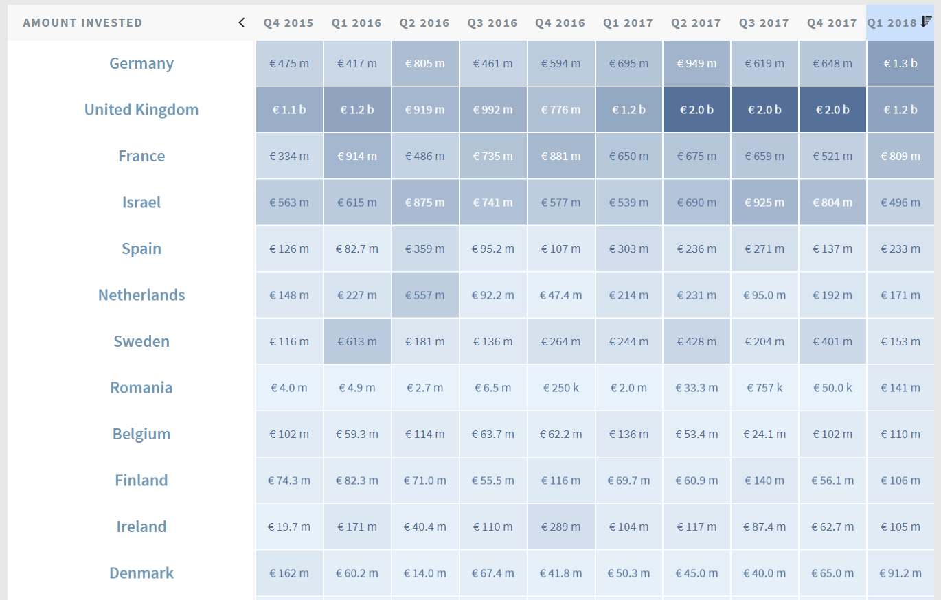 In Q1 of 2018, European companies received €4.9 billion of investment from investors globally. Compared with previous quarters, this was the third most active quarter ever, as the below interactive chart shows. To view the underlying rounds, click on the chart columns.
