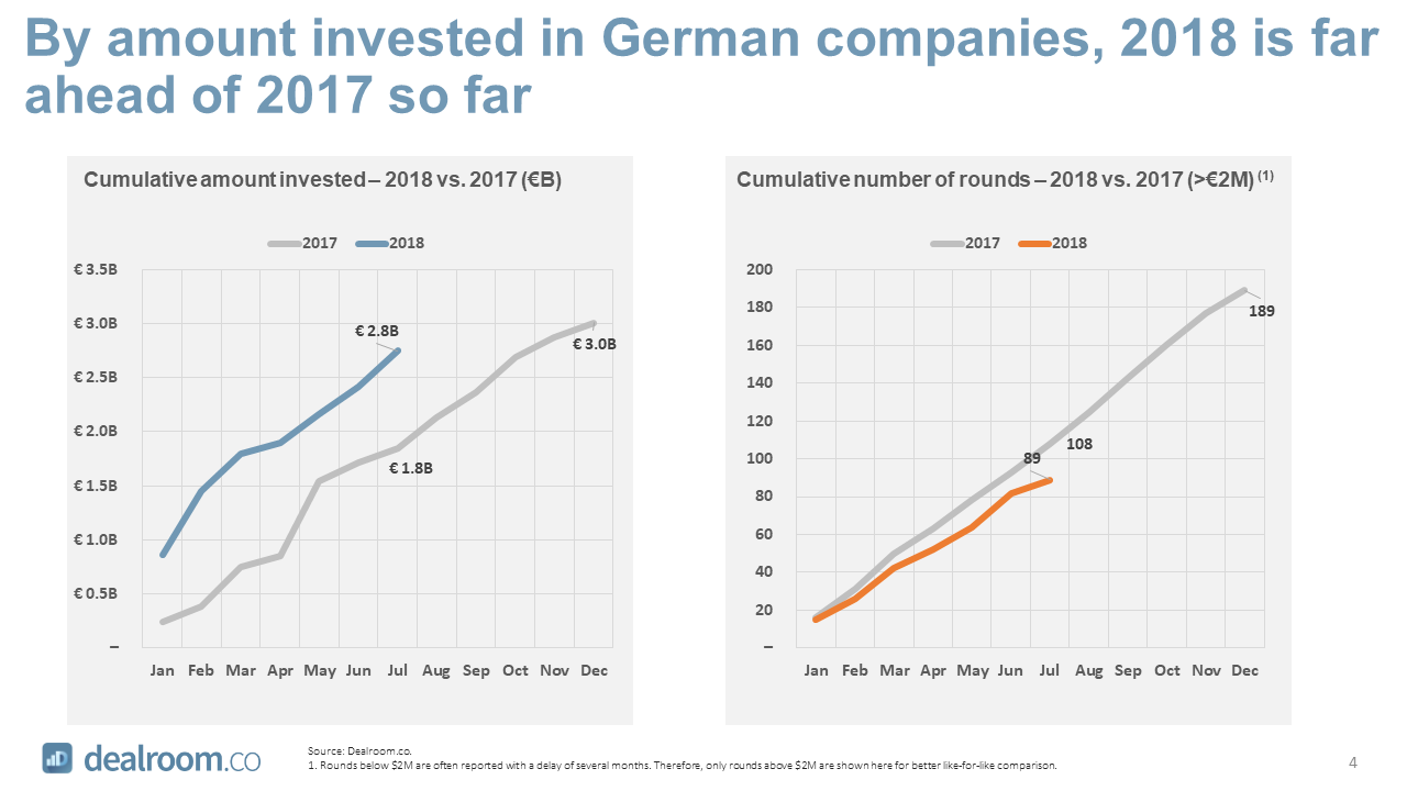 To a very large extent this is driven by mega rounds, which have become more frequent and bigger in Germany. The impact of mega rounds has been more significant in Germany than in the UK or France. Charts in the report (link below) illustrate this point. The following link allows you to analyse 2018 and previous years in more details: