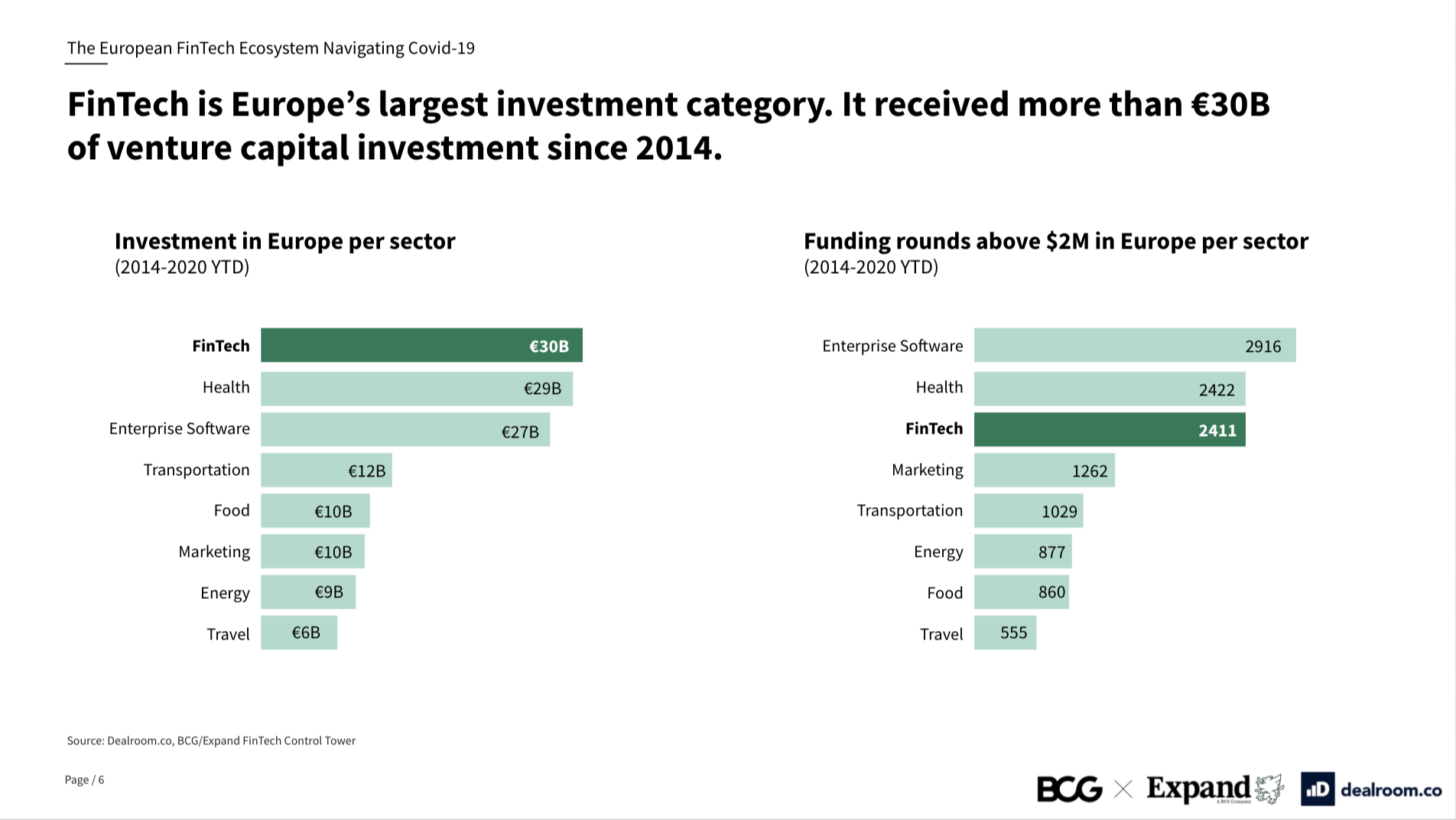 Fintech was among the first European tech sub-sectors to garner the attention and envy of the world, but how is it faring in 2020. We’ve joined forces with BCG/Expand Research FinTech Control Tower to apply their taxonomy to Dealroom’s exhaustive data set to analyse the European Fintech Ecosystem navigating Covid-19.
