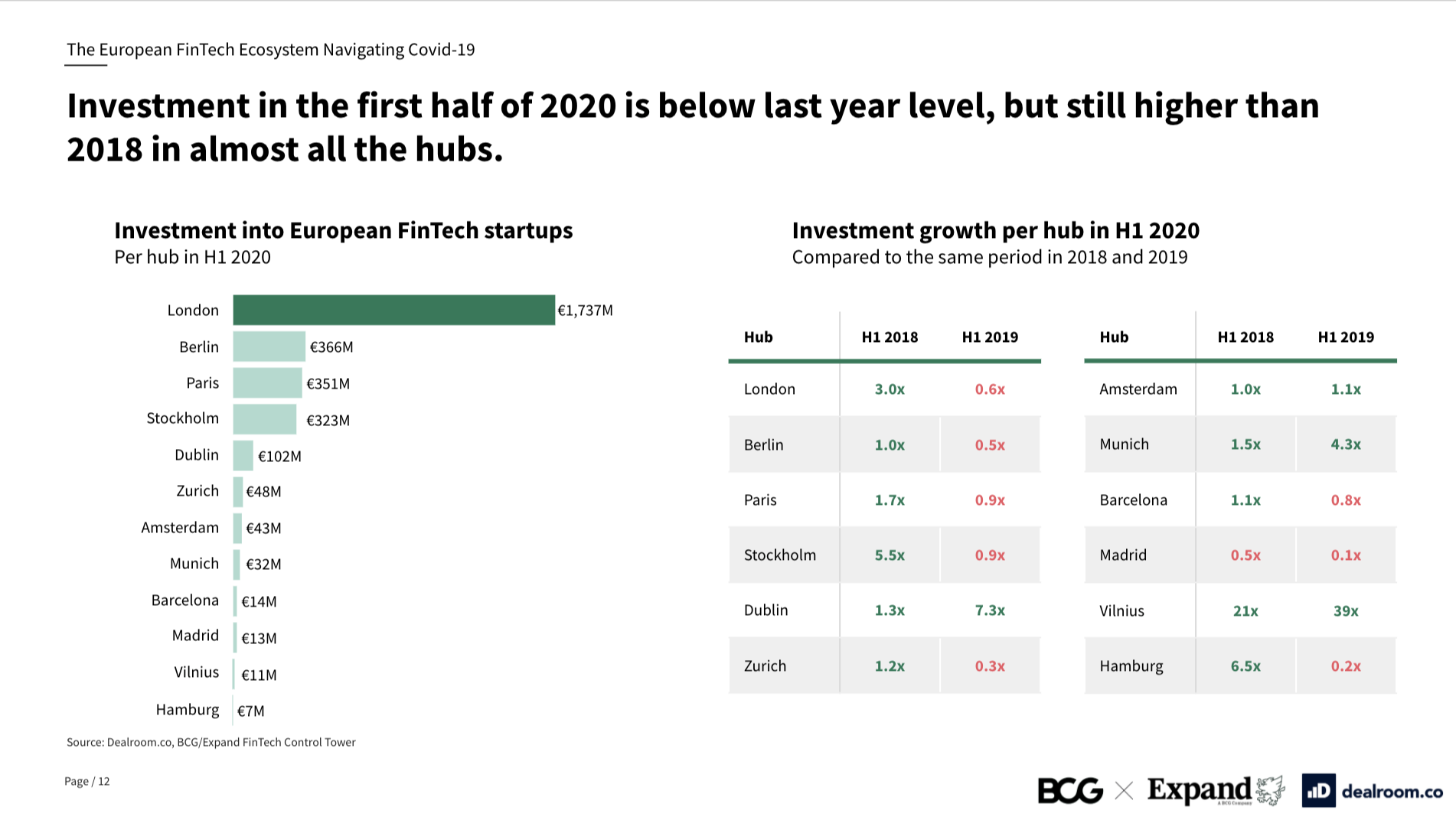In the unique first half of 2020, investment was below 2019 levels, but still higher than 2018 in almost all major European hubs. London dominates investments into European fintechs, claiming 57% of capital invested in H1 2020.