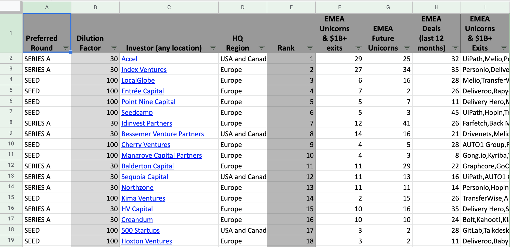 Like last year, we have separate rankings for Seed and Series A investors. This year, however, we re-introduce a general ranking, which combines late-stage, Series A and Seed investors. In order to allow for meaningful comparison, we introduce a dilution factor.