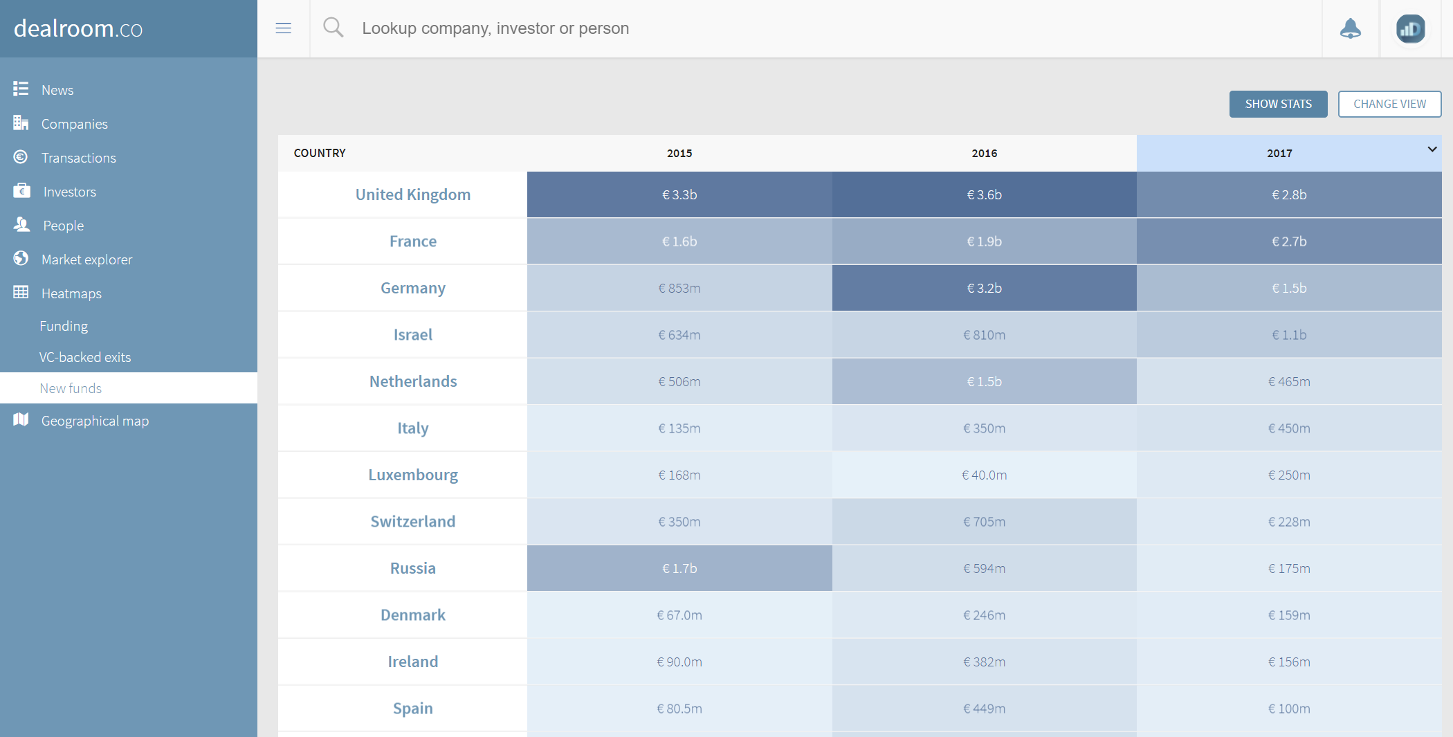 You can now view new VC funds by country. As you can see below, UK and France are going head-to-head by amount of new funds raised by VCs: