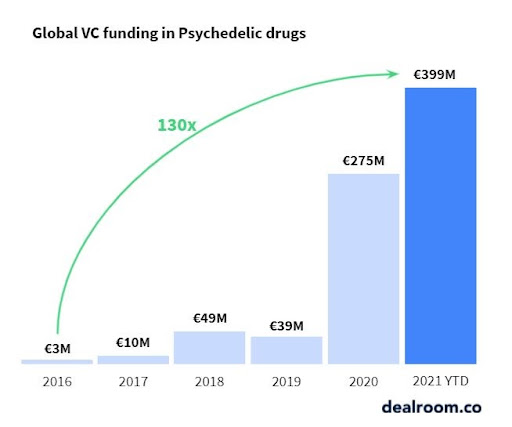 Global VC funding in psychedelic drugs has gone from €3 million in 2016 to €399 million 2021YTD, a 130x increase. The largest rounds, so far, has been for the German ATAI Life Sciences ($157 million Series D and $125M Series C), followed by COMPASS Pathways $80M Series B.