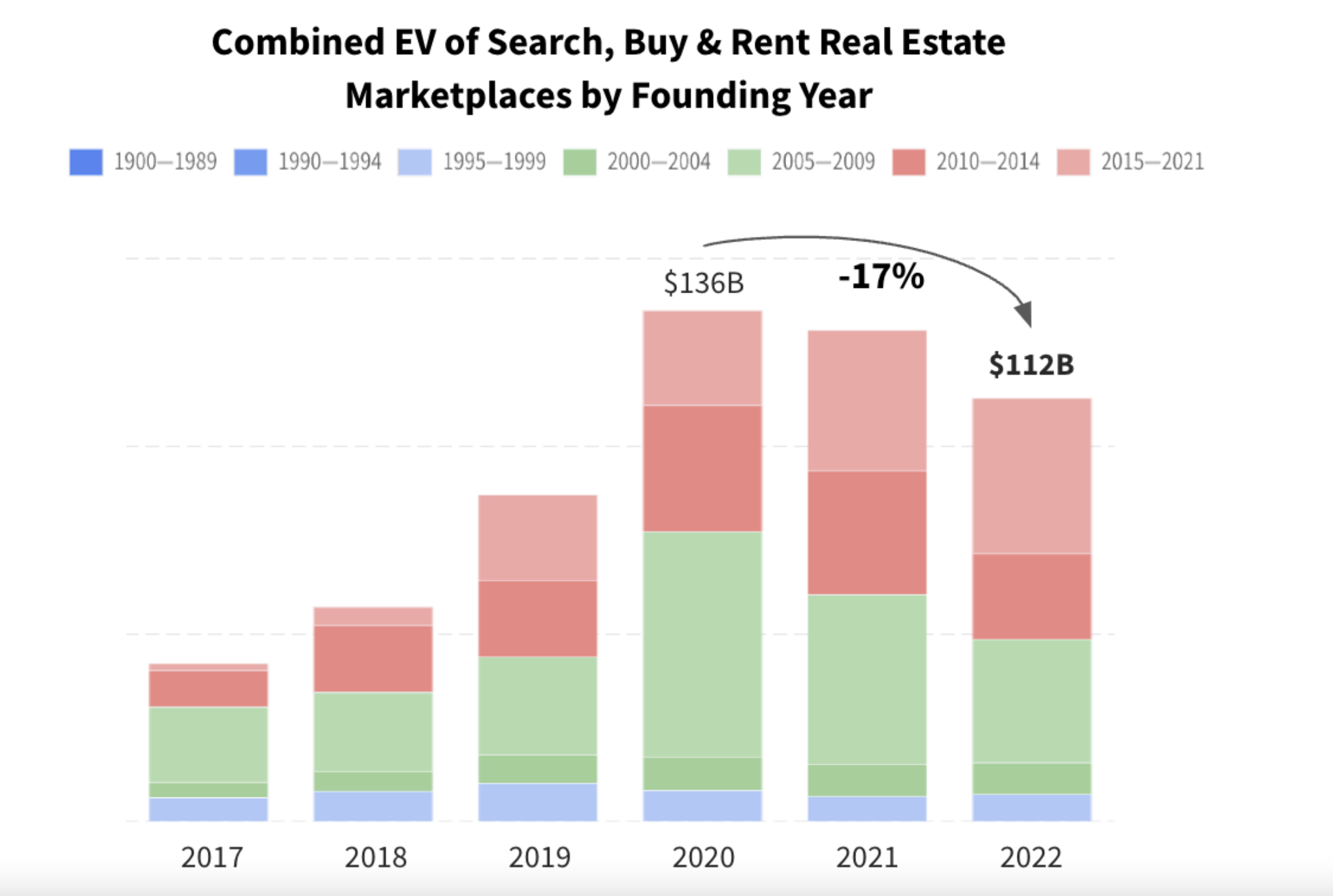 Search, Buy & Rent real estate marketplaces contain over 45% of the total EV in the segment, but have declined in 17% since 2020 and currently stand at $112B in EV and funding has declined almost 60% since 2020. Even with the negative news, real estate remains one of the biggest asset classes in the world and one of the lowest tech adopters. There is plenty of room for marketplaces to still carve out of the market.