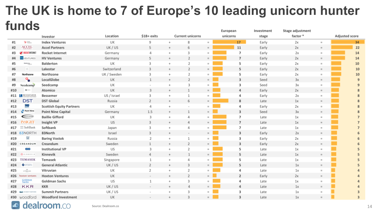 As a result of the above, most of Europe’s most succesful VC firms are London based: Index, Accel, Balderton, Northzone (dual HQ in Stockholm and London) and seed investor LocalGlobe. The below league table by Dealroom shows that the UK is home to 7 out of 10 top unicorn hunters.