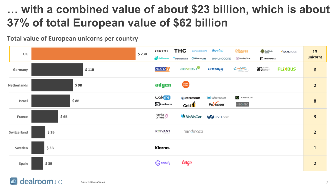 These unicorns with a combined value of about $23 billion, which is about 37% of total European value of $62 billion.