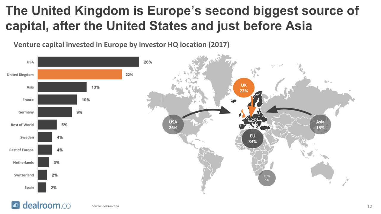 Is it fair to frame this as a competition? On the one hand, some healthy competition between ecosystems may eventually benefit its constituents (startups). However, it is also too simplistic. The below chart shows that investors from the UK are the biggest source of European venture capital.