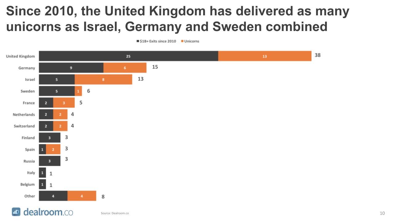 So far that’s just a snapshot of unicorns today. But historically, too, UK has been the most consistent in delivering exits above $1 billion in value almost every year. Only Germany comes close in terms of consistency. As a result, the United Kingdom has astonishingly delivered as many unicorns as Israel, Germany and Sweden combined, since 2011.