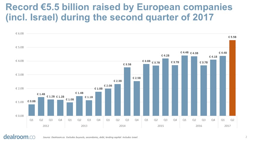 While we are still gathering data, it seems safe to say that, with more than €5.5 billion venture capital raised by European companies, this second quarter of 2017 sets an all-time record. This figure includes Israel, and excludes lending capital, buyouts, secondary transactions and debt (Auto1 Group’s €285m debt raise is excluded).