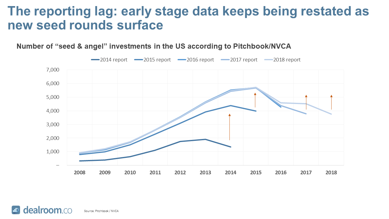 Because of a reporting lag, the most recent seed investment data is systematically understated. The below chart demonstrates the real issue. Seed investment data keeps being restated upwards in new reports, as new information surfaces. For example, the number of seed rounds in 2015 was first reported as 3,990, but two years later, this number had reached 5,680. That’s an increase of 42%!