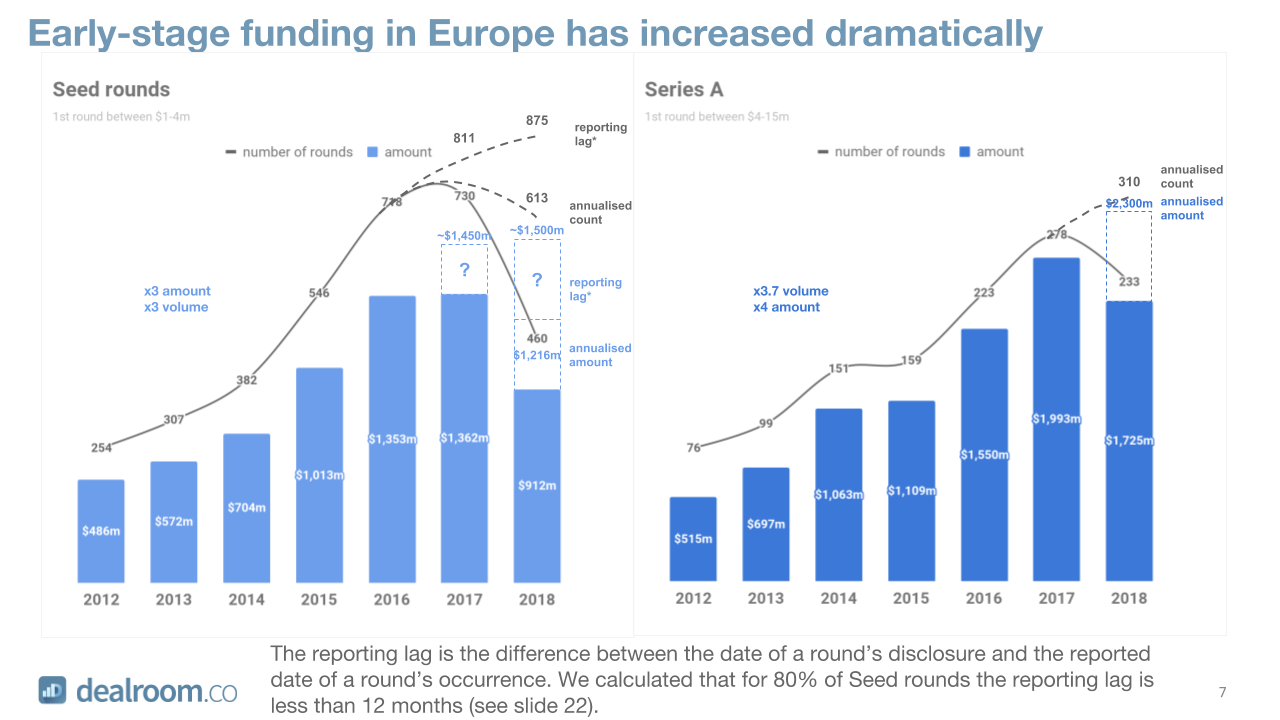 In a report called The Journey to Series A in Europe which we published in October 2018 in partnership with Atomico and LocalGlobe, we have analysed European seed investment data in detail. The dataset is based on Dealroom’s own database but with two important modifications.