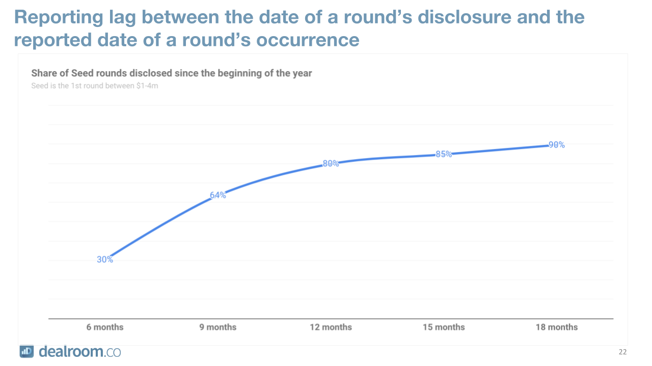 Venture capital investment data is all self-reported. That means there are few standards, little consistency, and no reporting deadlines. Fundraising announcements are essentially a marketing or signalling tool for the company, directed towards media, peers, customers, potential employees, and future investors. Seed investment data is especially hard to collect, as a result of these challenges. Often, seed rounds are only reported once the company completes certain milestones such as a Series A funding round, a key hire, product launch; whatever is needed to feel confident enough to go public.