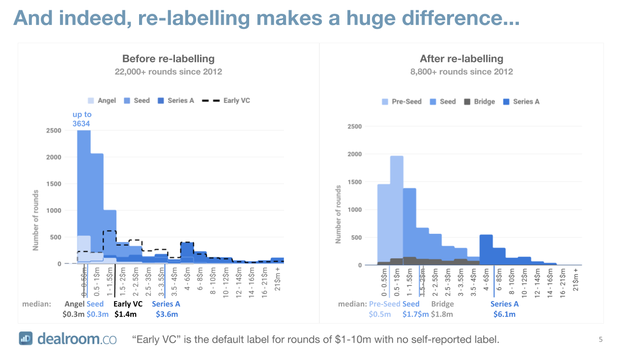 Second, we applied a systematic relabelling of more than 22,000 European funding rounds based on round size and sequence. In summary: