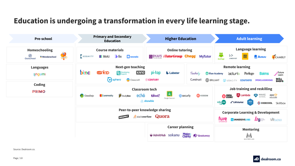 The pandemic is accelerating trends transforming education across every stage, through forced exploration and adoption of digital educational tools and services. As well as helping children and schools adapt to remote learning, the potential role of Edtech in adult learning and reskilling has been climbing national agendas, in the light of post-pandemic unemployment, and an automated future. Below is a snapshot of key players that digitize different stages of education.