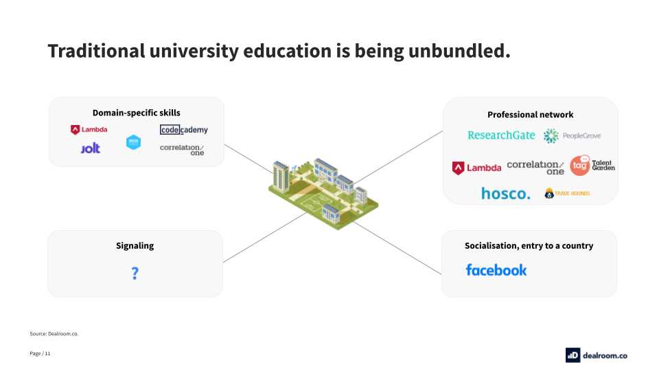 Higher Education has been largely undisrupted for a millennium. Universities, particularly in the US, increasingly look like a bad return of investment, as fees increase faster than wages. University value-add could historically be divided into 4 main bundles, and there are now companies targeting 1 or more of them.