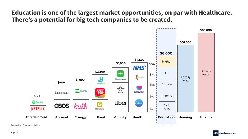 Education is the third biggest spending item per capita in the UK, among essential national spending. Like healthcare, the industry has not fully entered the digital age, making it a big prize for tech companies to crack. If the most recent generation of global decacorns have been built by targeting discretional spending, it reasons that the next generation of startups could be significantly bigger. However, Edtech accounted for just 1.5% of global VC investment between 2014 and 2020.