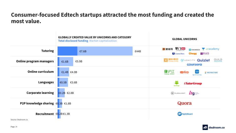 Tutoring startups and other consumer-focused unicorns have driven the bulk of Edtech value creation. Whereas the real value creation in the B2B space, dependent on corporate and school budgets, is yet to come.