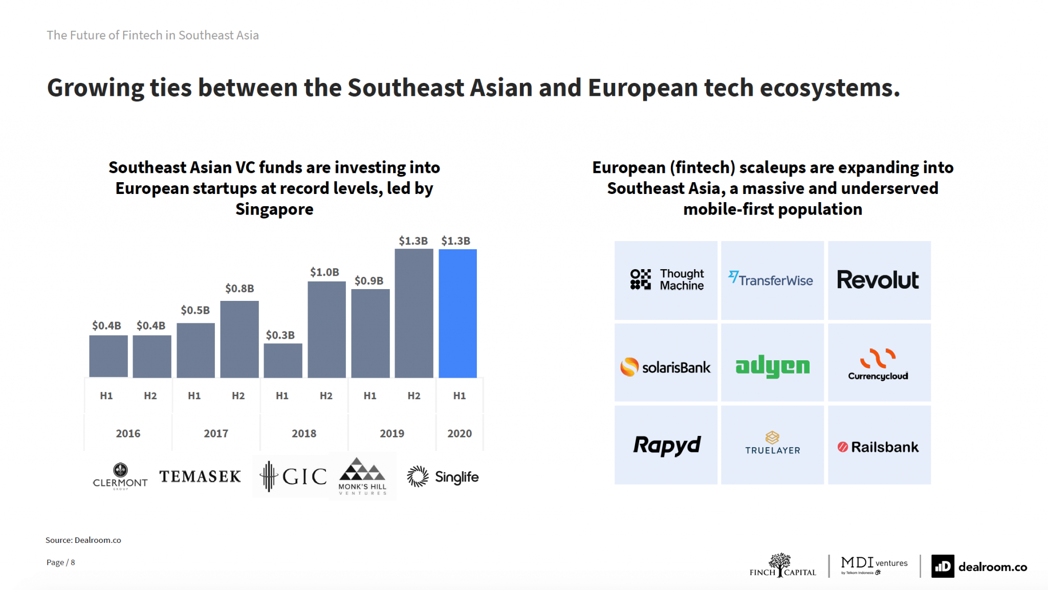 Cross continental tech and fintech ties are growing between Southeast Asia and Europe. Investment by Southeast Asian investors into European startups is at record levels, and many established European fintechs are expanding services and office presence to Southeast Asia.