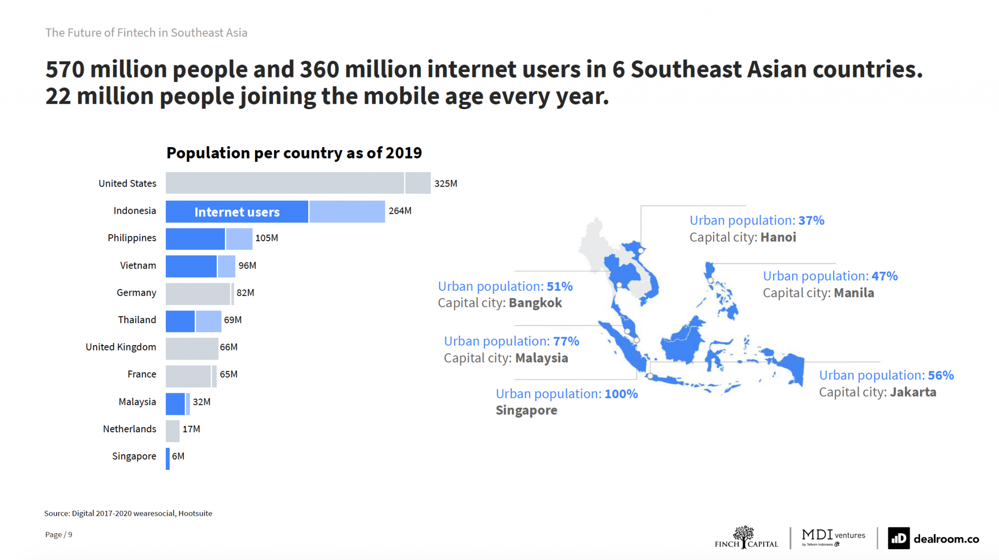 There are 570 million people and 360 million internet users in Southeast Asia (Indonesia, Singapore, Malaysia, Philippines, Vietnam, Thailand), with 22 million people joining the mobile internet every year.