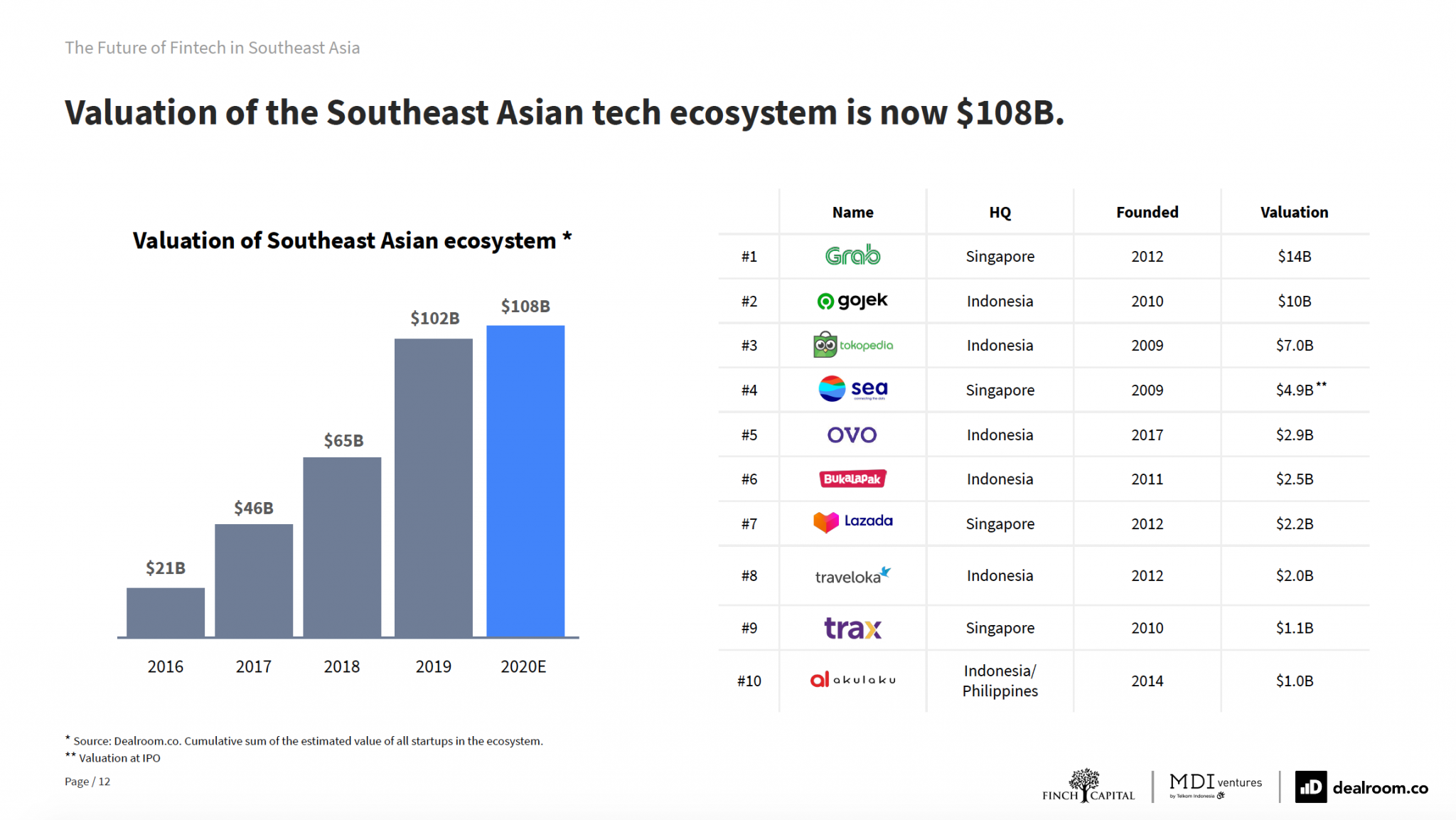The combined value of all startups in Southeast Asia has reached $108B in 2020. Indonesia and Singapore are the most valuable nations with tech ecosystems worth $60B and $35B respectively, and each home to 6 unicorns valued at over $1B.