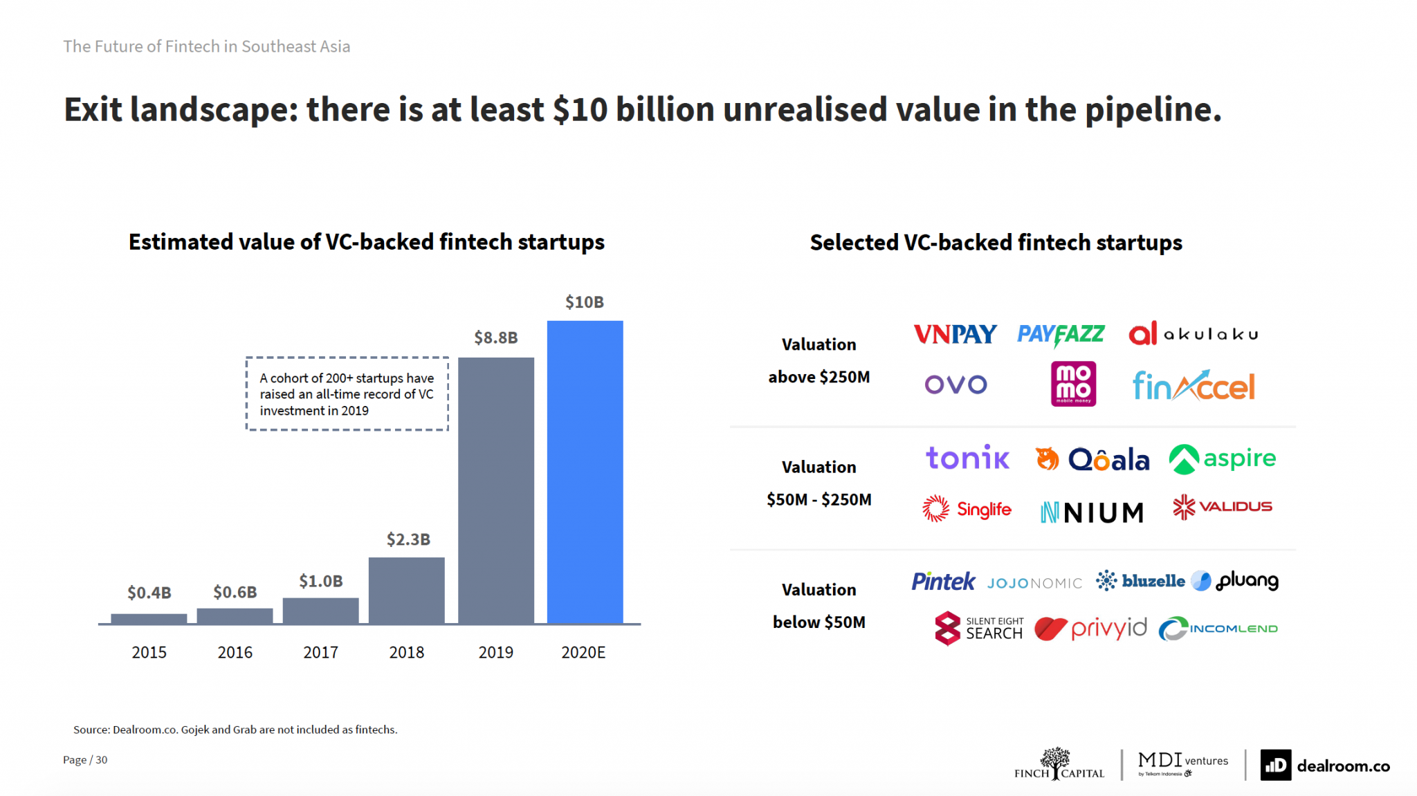 There is at least $10B of unrealised value in VC-backed fintech startups in Southeast Asia. Strategic M&As with local tech companies have been the most common startup exits in the region so far, with payments and Wealth Management startups the main acquisition targets. However, new targets emerged in Insurtech and Enterprise Software in 2020.