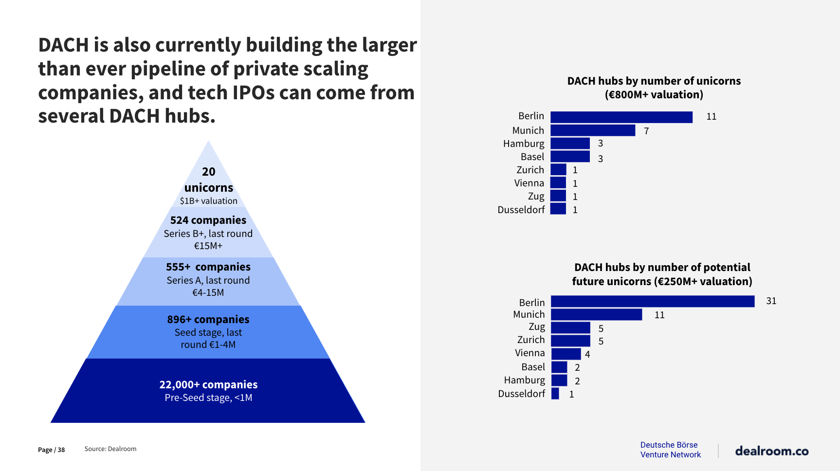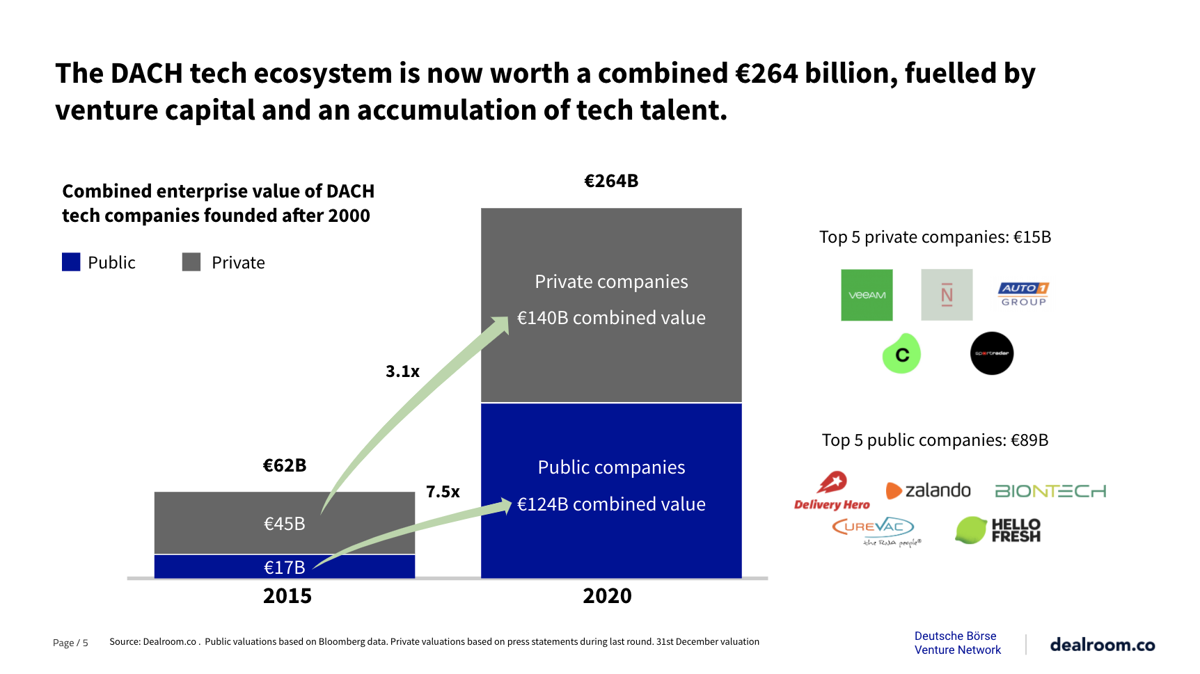 Public and private capital and investor groups are increasingly interconnected. The tech ecosystem in DACH is now worth a combined €264 billion, with half of that publicly listed. As investors seek exposure to early-stage tech companies, investor silos are breaking down. In partnership with Deutsche Börse Venture Network, our new report explores the DACH venture capital landscape, high-growth companies as exit outlooks, as well as how VC-backed growth companies have fared since going public.