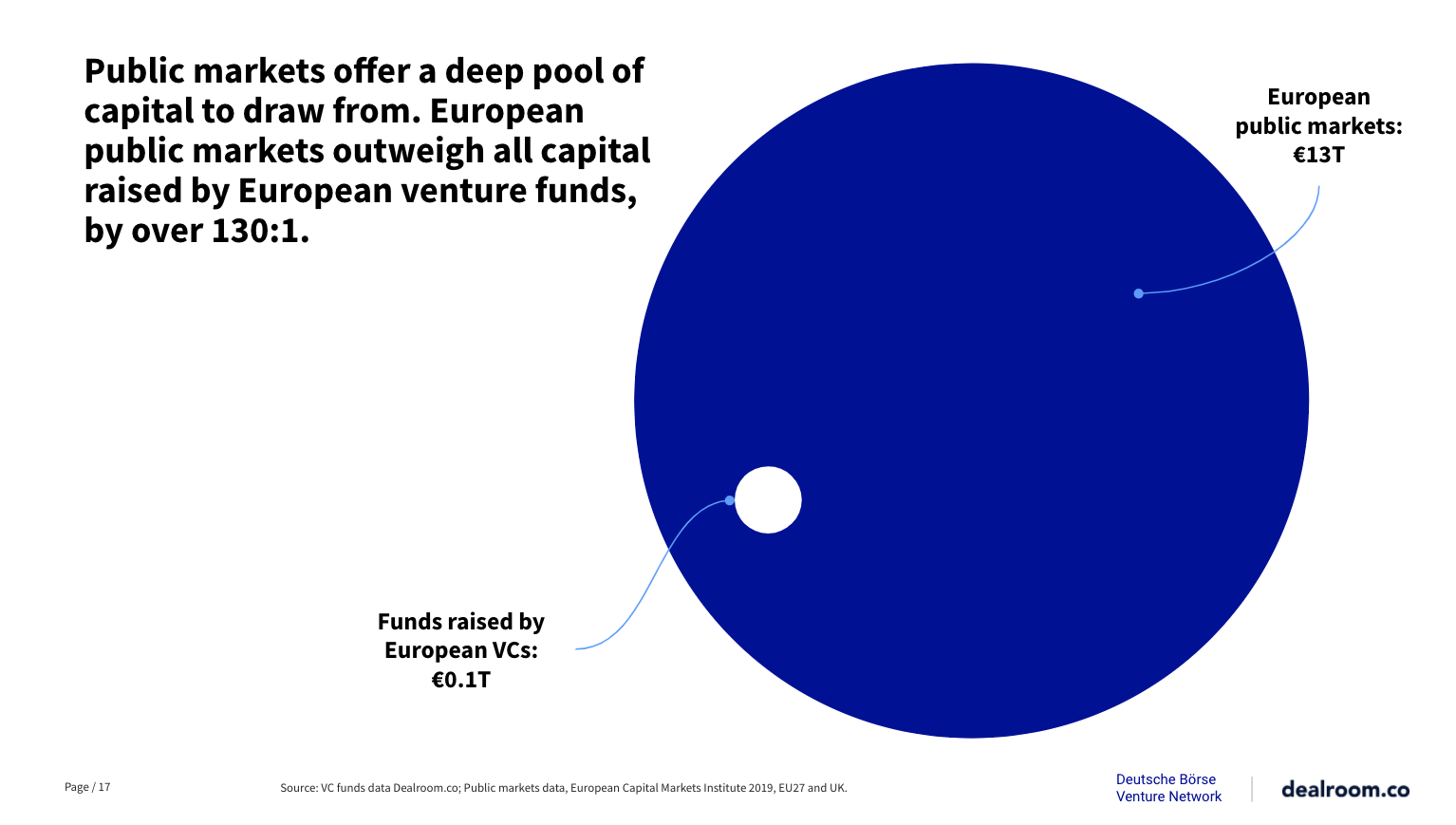 Despite ever climbing levels of capital being raised by global venture funds, VCs still cannot meet startup capital demands. By comparison European capital markets are worth 150x what all European VCs have raised in the last 10 years, offering an accessible financing route for tech SMEs as well as headline-grabbing unicorns. The historically siloed private and public markets are starting to collaborate more closely.