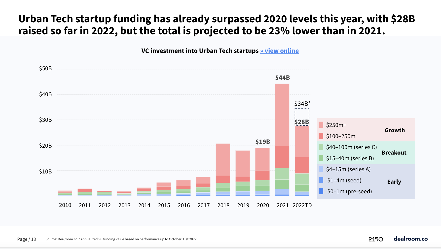 Urban tech startups have collectively raised $28B in 2022 to date. While this is already more than was raised in the full year of 2020 (or any year prior), it is projected to fall short of last year’s total by 23%. This is against a backdrop of a broad pullback in venture capital investment in every sector amid a global economic downturn, but this loss of momentum is nonetheless a blow to net-zero targets.
