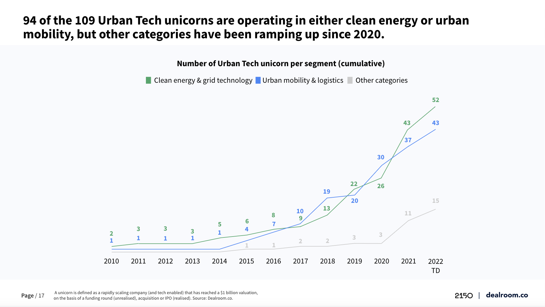 Globally, the Urban Tech ecosystem has now produced over 100 unicorns – startups valued at over $1 billion – with the vast majority emerging within Clean energy and grid technology, and Urban mobility and logistics.
