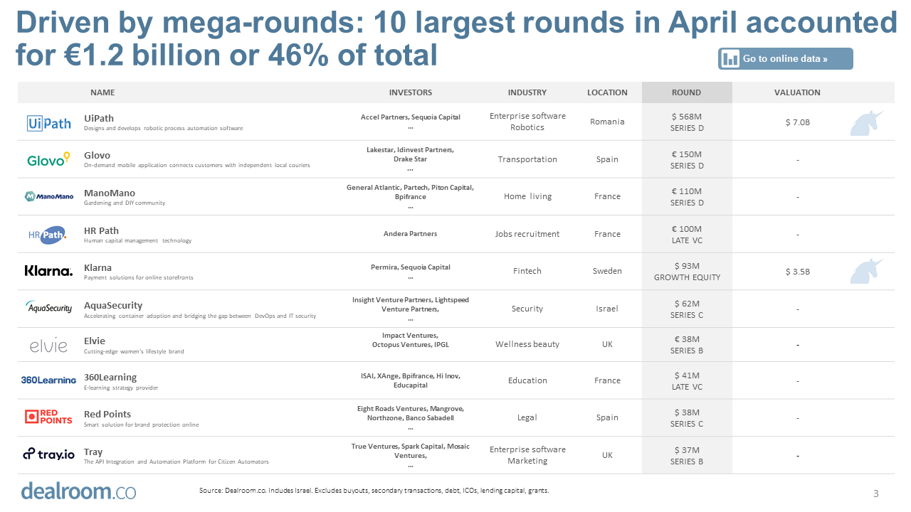 With an investment of €2.5 billion (including Israel) April is in line with average monthly investment in the last 12 months. The investment activity was driven by mega-rounds: the 10 largest rounds in April accounted for €1.2 billion or 46% of total